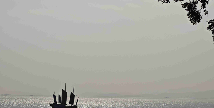 在湖中远处回望鼋头渚,只见上下苍苍茫茫,水天一色,这一带湖岸好似横在半空中的一抹彩云,在轻轻漂移。