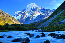 福克斯冰川全长13公里,从南阿尔卑斯山2600米的高处倾斜而下。四条高山冰川每年都会累积大约30米深的积雪,并注入福克斯冰川,积雪在冰川顶部压缩成数百米深的蓝色冰雪,十分壮观。 新西兰还有美丽的湖泊。