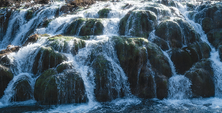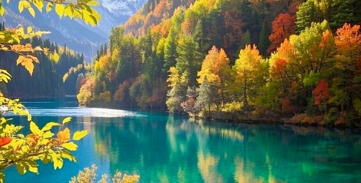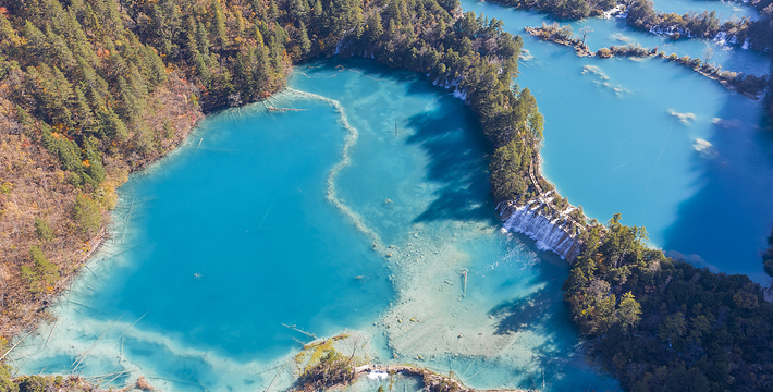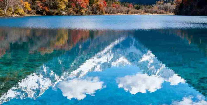 九寨沟四周群山耸峙,有雪峰数十座,高插云霄,终年白雪皑皑。河谷地带奇水荟萃,其间有成梯形分布的大小湖泊114个,瀑布群17个,钙华滩流5处,泉水47眼,湍流11段,以1870米的海拨高差,在12 座雪峰之间穿林跨谷,珠连玉接,呈Y字型串珠,逶迤近60公里、世界罕见的以高山湖泊群和瀑布群以及钙华滩流为主体的风景名胜区。湖泊小者数平方米7公里。湖水终年碧蓝澄澈,色彩斑谰,在阳光照射下,呈现出蓝、黄、橙、绿等多种色彩,绚丽夺目。天气晴朗时,蓝天、白云、雪山、森林倒映湖中,水光浮翠,美丽如画,并随季节推移呈现出不同的色彩和风韵,有“九寨归来不看水”之说。