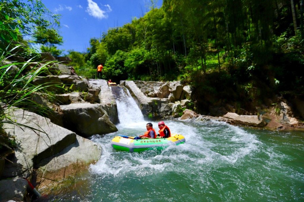 将军关探险漂流起于上游皖宁国市毛坦村境内,终于下游浙安吉县郎村境内,全长2.2公里,全程落差约130米,大落差达10米,总投资约1000万左右,是目前华东区域内具冒险性与挑战性的漂流项目之一。让您体验一漂跨越两省的惊险漂流运动。漂流区所在的将军关,是一处以峡谷景观为依托,以南宋关隘文化为内涵,以绝壁、奇岩、古桥、流溪、飞瀑为特色的山川风貌。