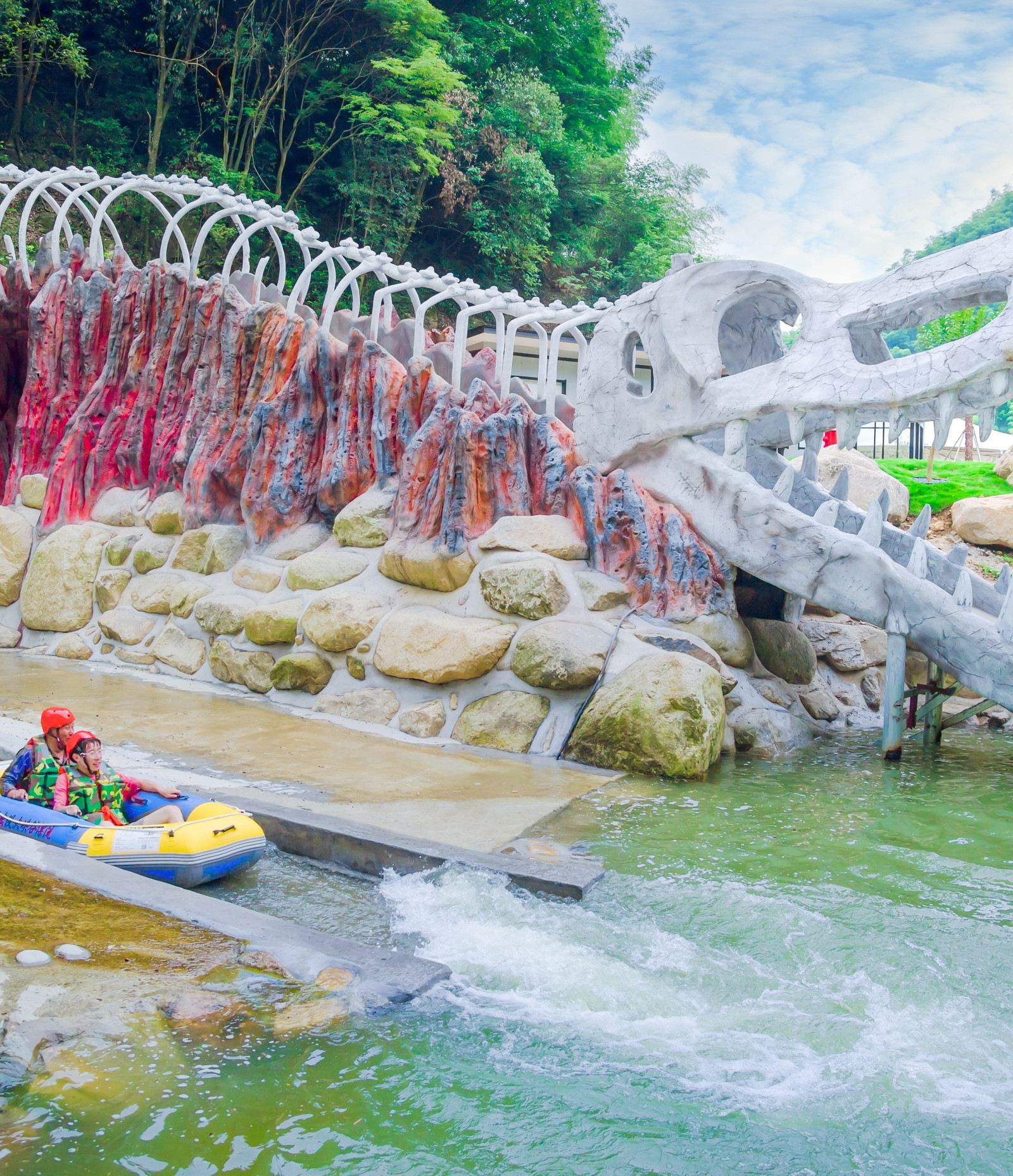 安吉龙出没大峡谷漂流位于浙江省湖州市安吉县杭垓镇大坑村,大坑历史悠久,相传古时在苕溪上游,有僧人在此参禅证悟得道涅槃,虹化之处留下大坑:有神龙潜踪蹑迹,庇佑守护此地,大坑因此得名。漂流全长约2.8公里,总落差约128米,2米以上落差12处,大落差 6米,全程设置蛟龙得水,群龙戏水,翼龙点水,神龙摆尾,龙游曲沼,盘龙入海,龙腾四海等17道不同关卡,惊险刺激河段达10余处,漂流游程约80分钟,是华东地区刺激的漂流之一。整个漂流处于大坑大峡谷之中,保留了峡谷的原始地貌和原生态植被,既能体验翻山越岭、一泻千里的惊险刺激,又能领略穿越竹林杉海的自然旖旎。游客乘坐皮划艇自山巅而下,时而飞流直下,一泻千尺,时而堕入深潭,惊涛拍岸,好似洪水侵袭;穿越惊心动魄的急流险滩,远处云漫青山,眼前树木葱茏,峡谷奇石星布成趣,与两岸县崖绝壁相互辉映,清新的高含量负离子幽谷空气,与散发着自然灵气的清澈溪水,让游客仿佛驾驭神龙畅游仙境。