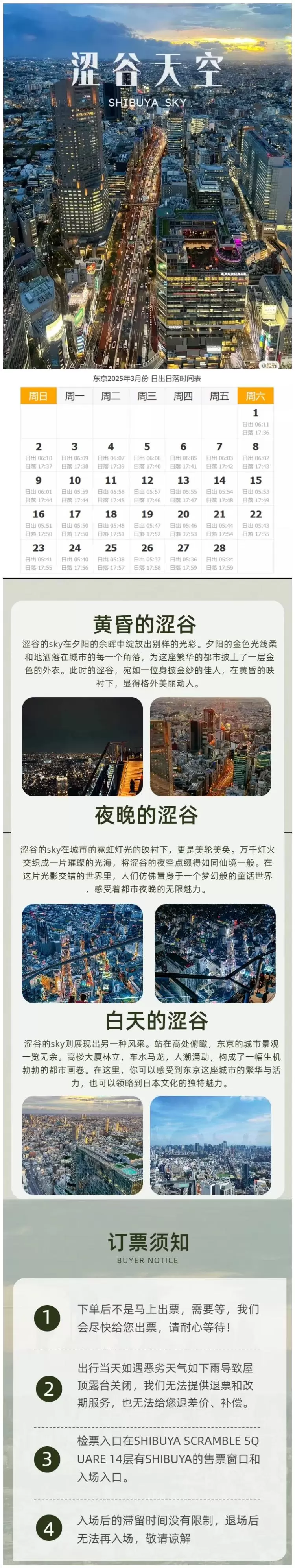 东京涩谷超人气景点SHIBUYA SKY 展望台,饱览浪漫的东京美景带你从229公尺高空俯瞰东京,无论是白天、黄昏,还是灯火辉煌的夜景,尽享360度无死角景观。站上位于46楼的露天展望台SKY STAGE,更能将东京铁塔、富士山等标志性景致尽收眼底。
