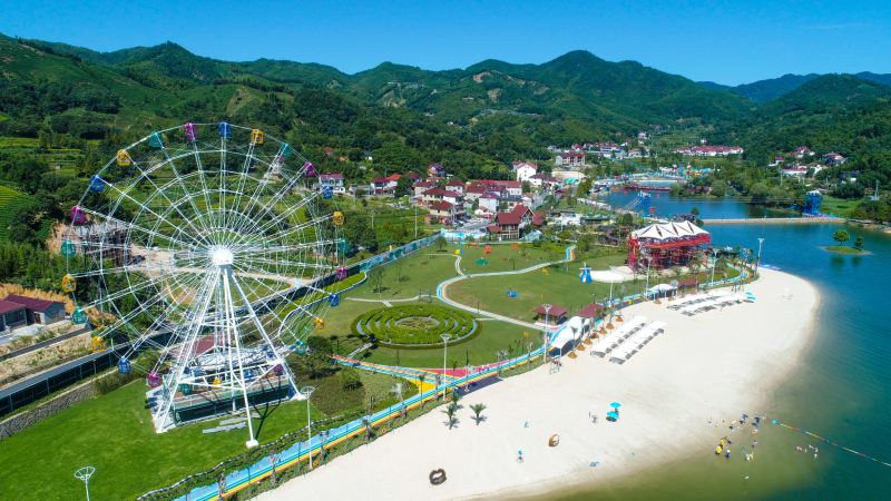 “荣耀天空之城”旅游度假区,坐落于“联合国人居县” — 浙江省安吉县天子湖镇境内。占地总面积超3800亩,拥有森林、水库、竹海、草原、沙滩等生态资源,坐拥青山绿水,定位全域旅游高质量发展,以得天独厚的自然资源和旅游相结合,依靠依山旁水的优势资源,景区打造了一系列专属荣耀天空之城的景点项目,一、二期开放项目有:天空①号云端漂流、摩天轮、丛林迷宫、荣耀之星、水寨、网红桥、步步惊心桥、独木桥、喊泉、小游船、阳光沙滩等娱乐项目,并为了满足游客吃喝玩乐的服务需求,我们专门设置了小火车餐厅和团队旅游接待餐厅等供游客就餐的区域。目前只开放了一、二期项目,三期开放后还将会看到我们的星云度假酒店、微风山谷自然民宿、国际研学基地等等。景区的配套也将会逐步的完善,旨在打造“乐游云端,阳光沙滩”的独特美域,让我们的游客有一种宾至如归,意享山水、怡然自得的体验感。