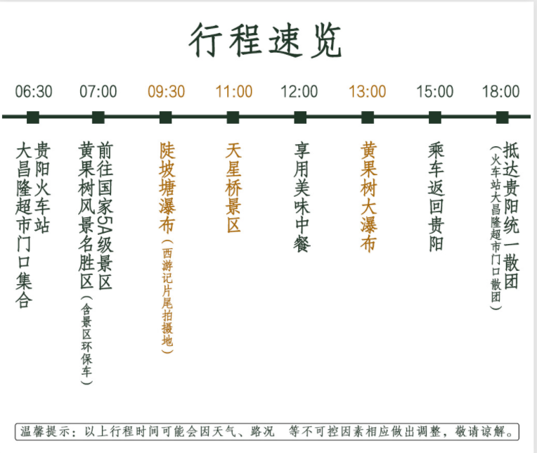 6:30(参考时间)市区发车站点(火车站大昌隆超市对面)集合上车。全程经贵黄高速公路(高速路上无突发事件,无堵车等情况)车程2.5小时左右抵国家5A级景区——【黄果树】