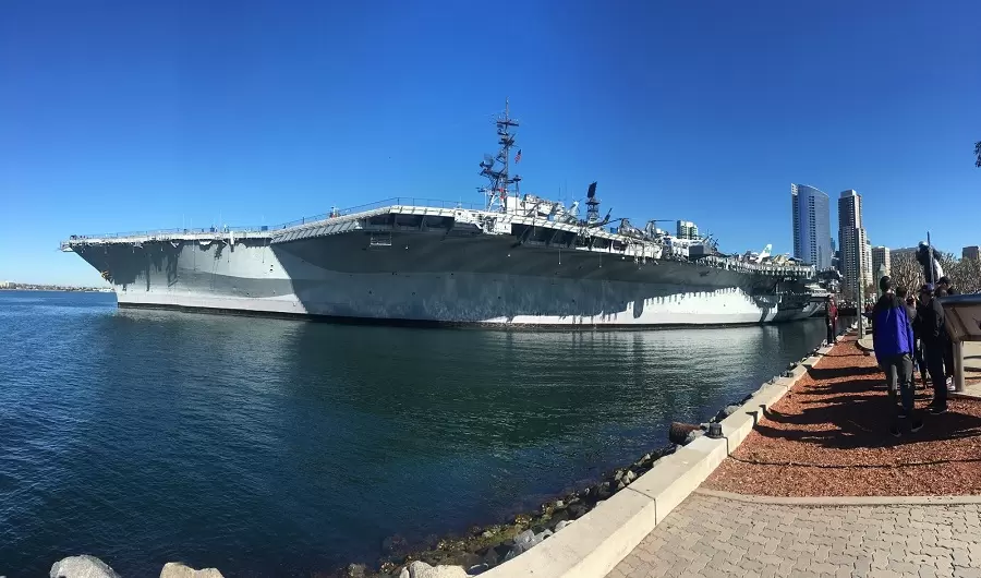 一艘曾经战功赫赫的退役航空母舰,现在永久地停泊在圣地亚哥商业区海滨,开放参观。这艘巨船的甲板上停满了二战至沙漠风暴行动期间使用的战斗机,游客不仅可以观看,还可以登上飞机参观机身内部。其它互动展品包括身临其境聆听军事飞行员之间的对话录音,以及乘坐飞行仿真器。