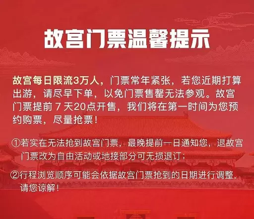 部分景区如遇政策及其他原因临时闭馆或预定人数限制,导游会临时调整行程,景点顺序会前后调整(不会减少景点),请谅解。