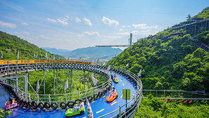 森林氧吧环境不错,爬到山顶可以先做滑草滑一段(就是有点吓人,中间特别快感觉要翻车),再走一段路,可以坐小火车到山脚,两个人一辆车,还是挺好的,自己控制速度,不吓人,小孩可以玩;然后千万不要买和千岛秘境的联票,那个地方就是个大坑,里面就一个大佛,看起来很荒凉,都没有人