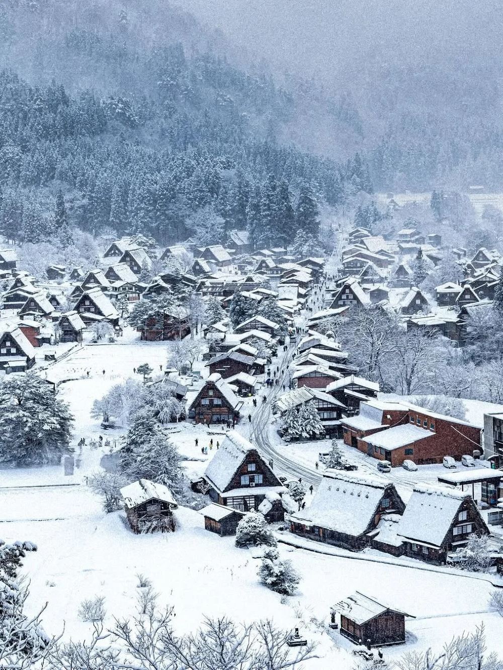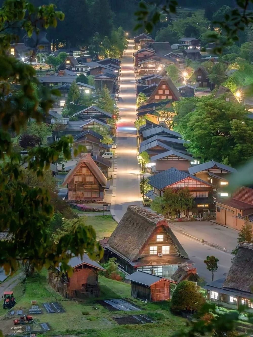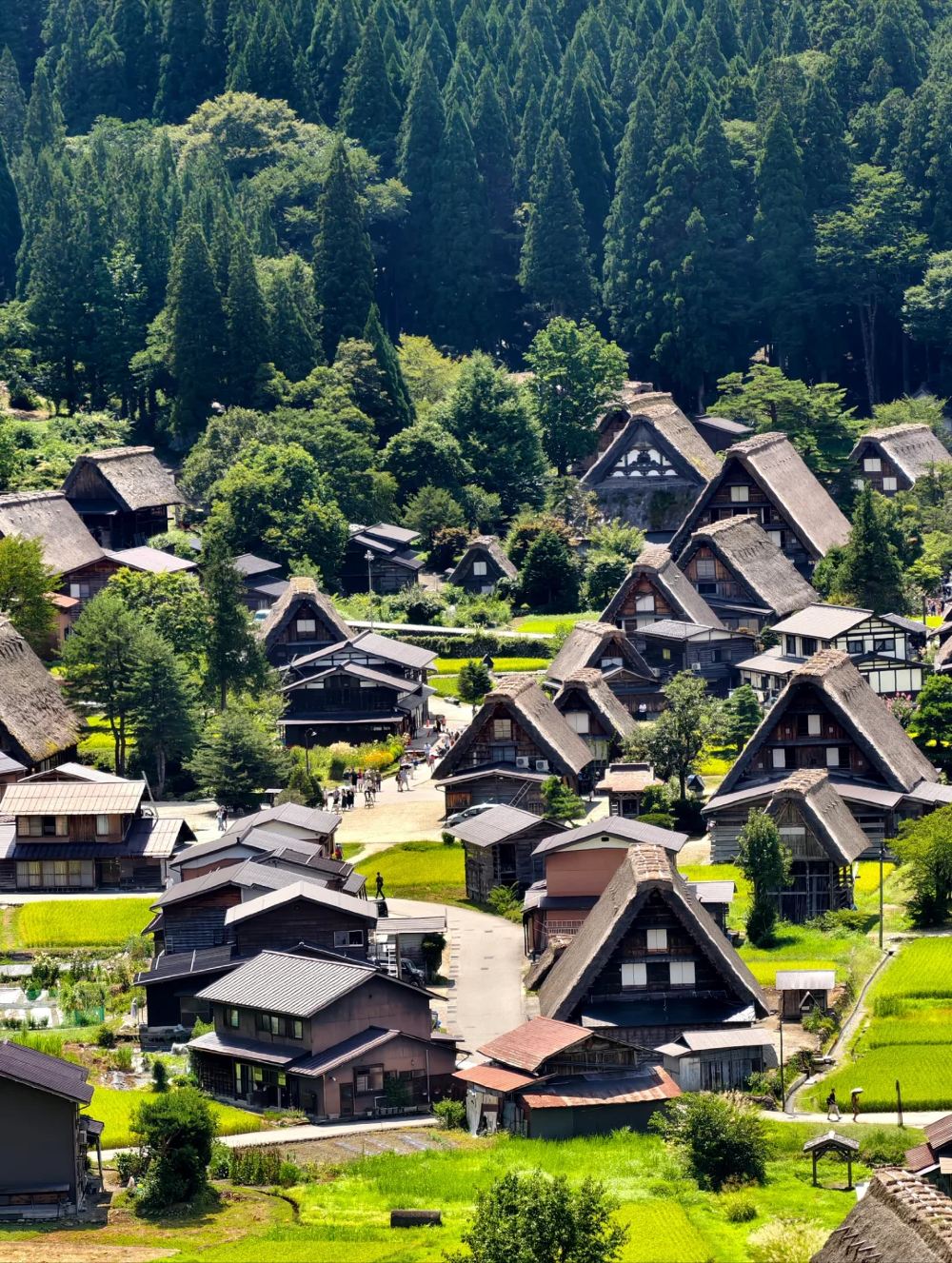 ▲ 白川乡四面环山、水田纵横,涓涓河川流经而过,被称为森林和溪流的王国。白川乡荻町的村落是三个被登录为世界遗产的村落(白川乡、五箇山的相仓和菅沼)中,户数最多的村落,有 152 户。灵峰白山所流出的大白川,与庄川汇合后会变得雪白浑浊,这就是白川乡地名的由来。城山展望台在白川乡荻町合掌村的东北部,在这里,合掌村和绵亘的白山一览无遗。