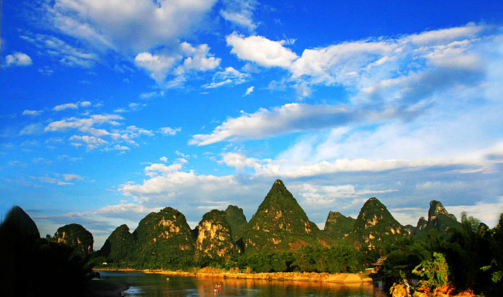 从桂林乘坐漓江游船到阳朔。船票价格180元/人,船票很好买,桂林市区各大酒店及旅行社都有分销点。开船时间在9:00-10:00之间,经过5个小时“黄金水道”之旅,饱览“漓江百里画廊”两岸秀丽风光,最后在阳朔龙头山码头上岸。